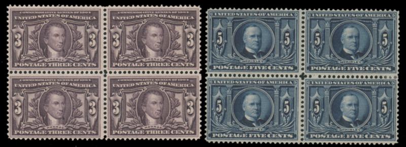 1904, 3c-5c LOUISIANA PURCHASE BLOCKS MINT NEVER HINGED, #325-326, fresh, fine-very fine, cat. $1,400.00 (Image)
