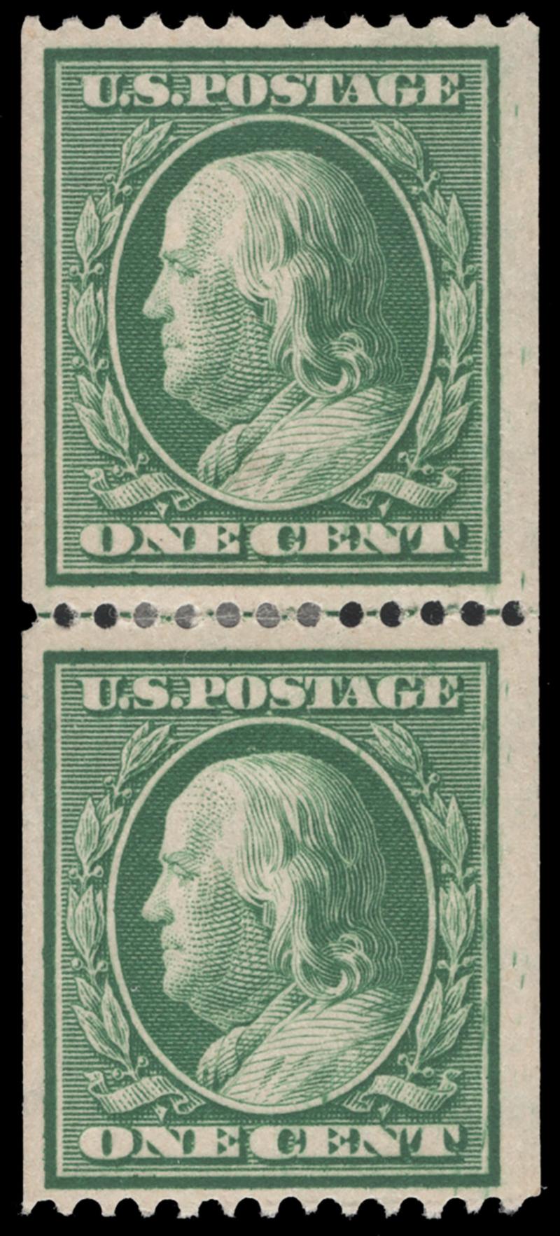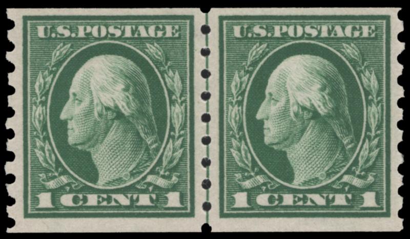 1912, 1c GREEN PERF 8½ COIL GUIDE LINE PAIR MINT NEVER HINGED, #412, fresh and beautifully centered, very fine - extremely fine, with 1999 P.F. cert., cat. $260.00 (Image)