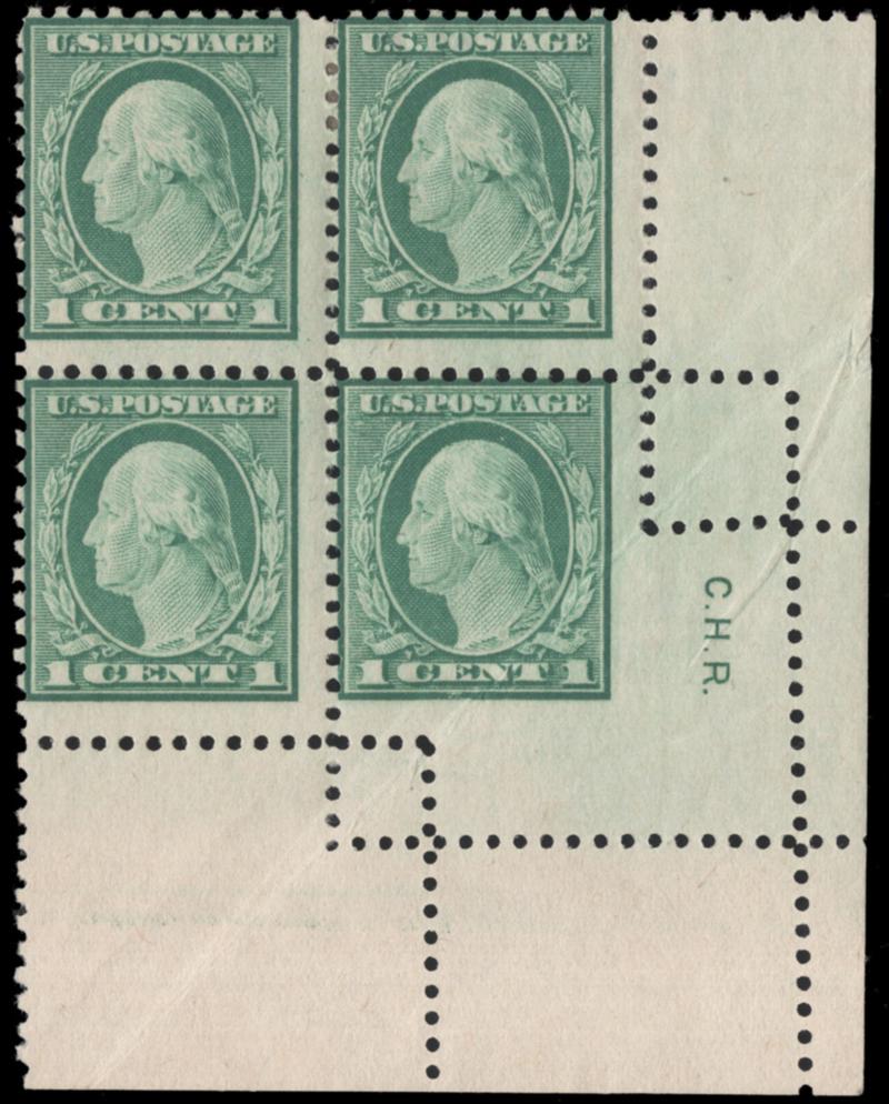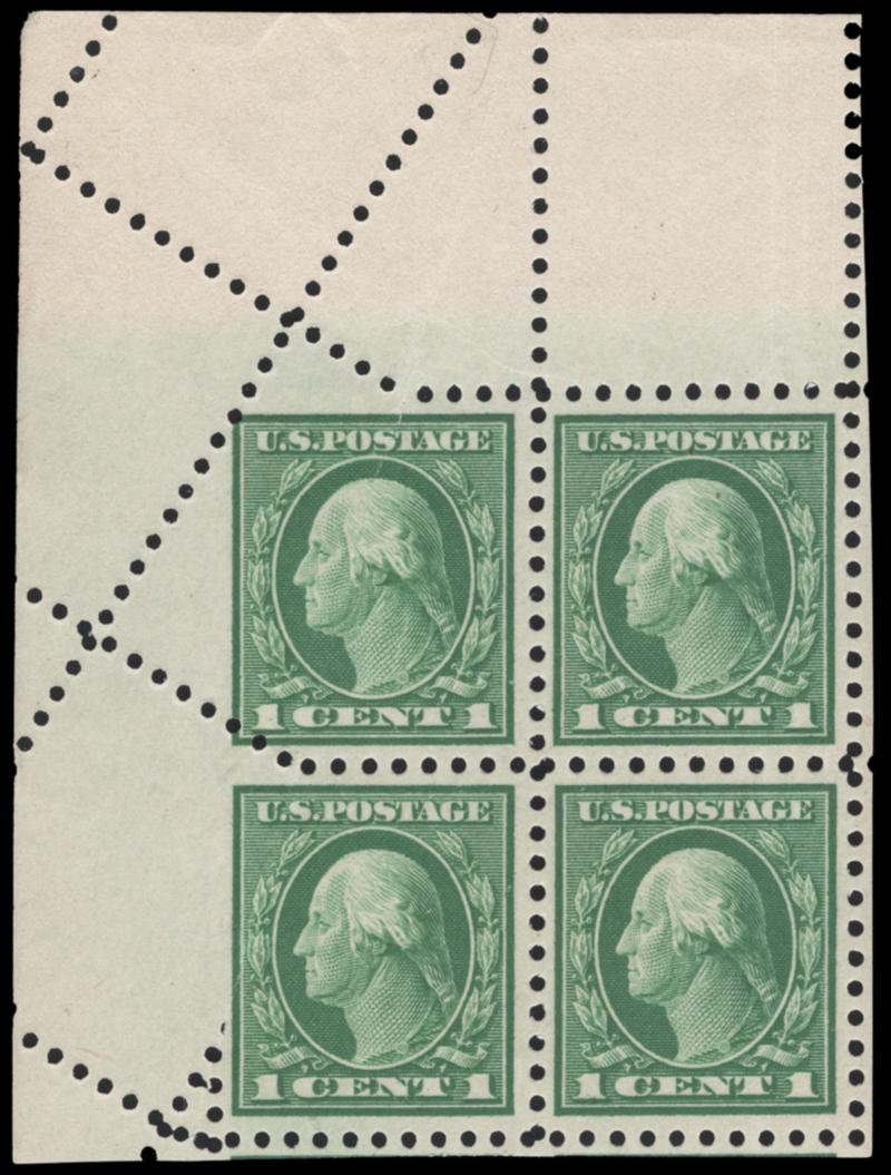 1917, 1c GREEN - PARTIALLY IMPERF IN FOLDOVER BLOCK - MINT, #498, bottom right single partially imperf with siderographer's initials, fine (Image)