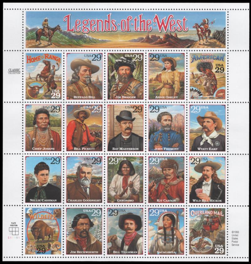1994, LEGENDS OF THE WEST RECALLED SHEET NH, #2870, very fine, cat. $125.00 (Image)