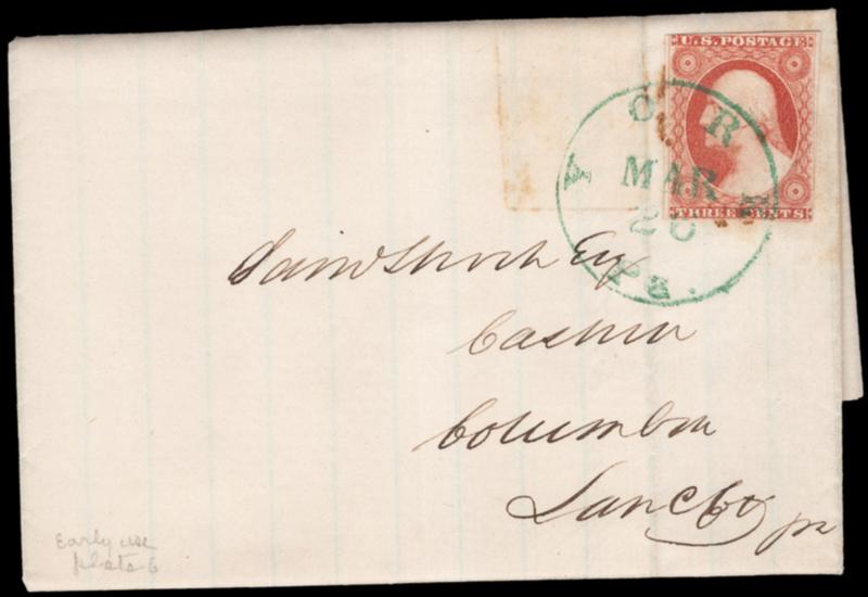 1851, 1c DULL RED TYPE I USED ON COVER WITH GREEN CANCEL, #11, margins to just in, tied by bright green York, PA d.s. on March, 1856 folded letter to Columbia, PA, with 2025 William T. Crowe cert. (Image)