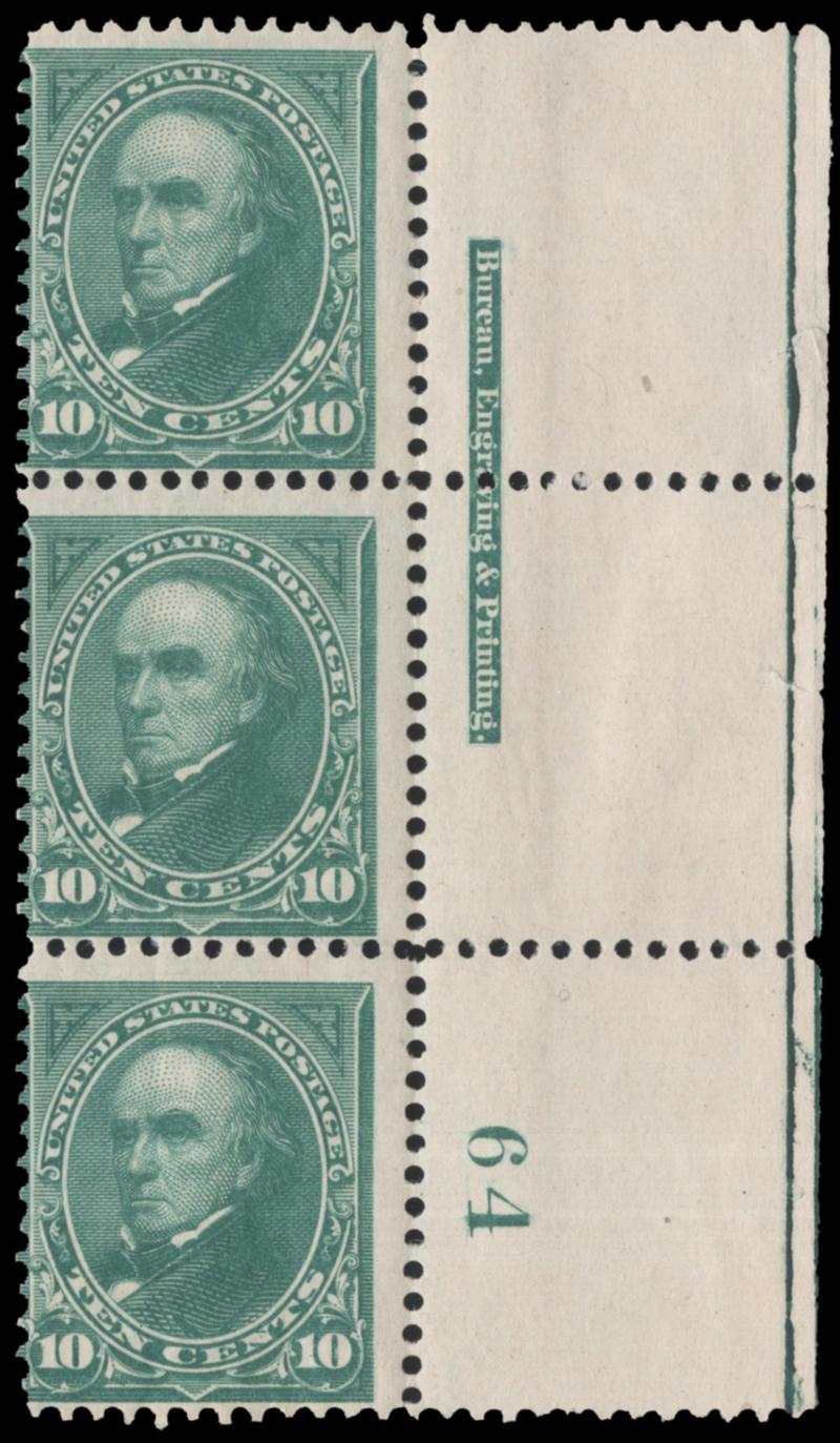 1894, 10c GREEN RIGHT IMPRINT & PLATE #64 STRIP OF THREE MINT, #258, previously hinged, very good, cat. $1,250.00 (Image)