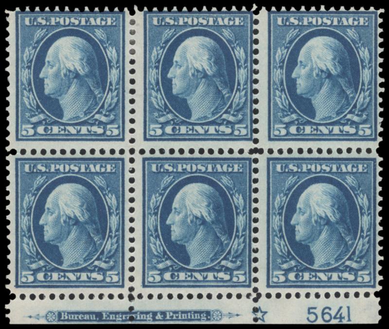 1911, 5c BLUE SINGLE LINE WML BOTTOM IMPRINT, STAR & PLATE #5641 BLOCK OF SIX MINT, #378, previously hinged, fine, cat. $350.00 (Image)