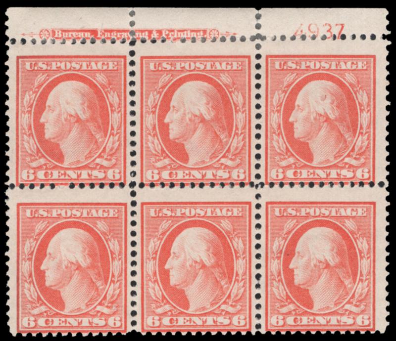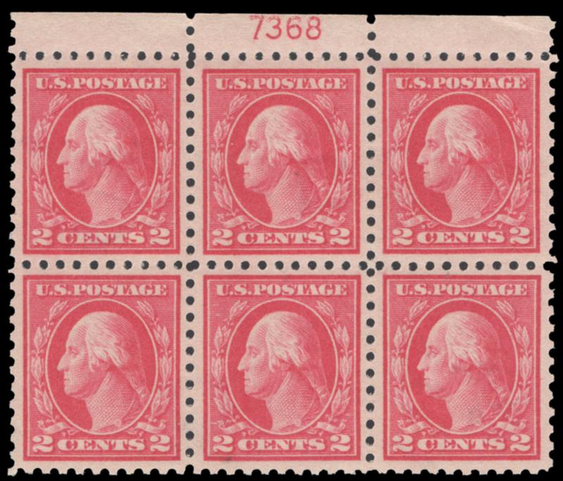 1914, 2c ROSE RED TYPE I TOP PLATE #7368 BLOCK OF SIX NH,#425, choice centering, extremely fine, cat. $75.00 (Image)