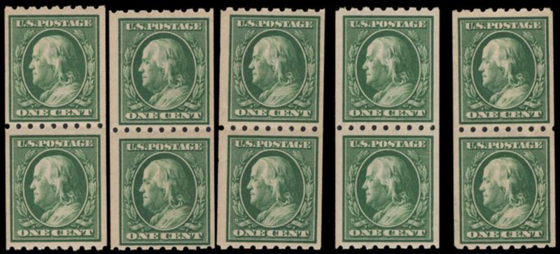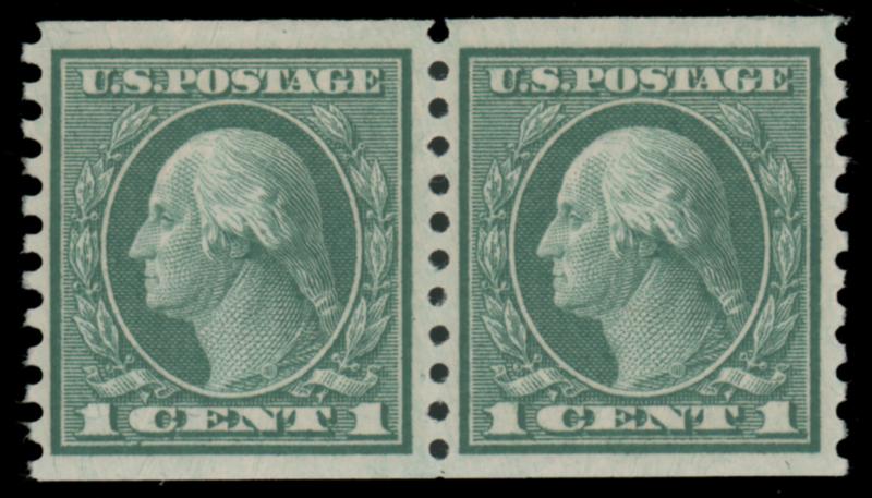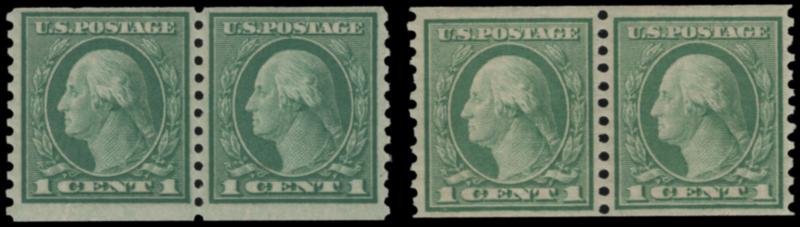 1916, 1c GREEN SMALL HOLES COIL PAIR NH, #490a, fresh, regular coil pair included as well, fine-very fine, listed but unpriced is Scott (Image)