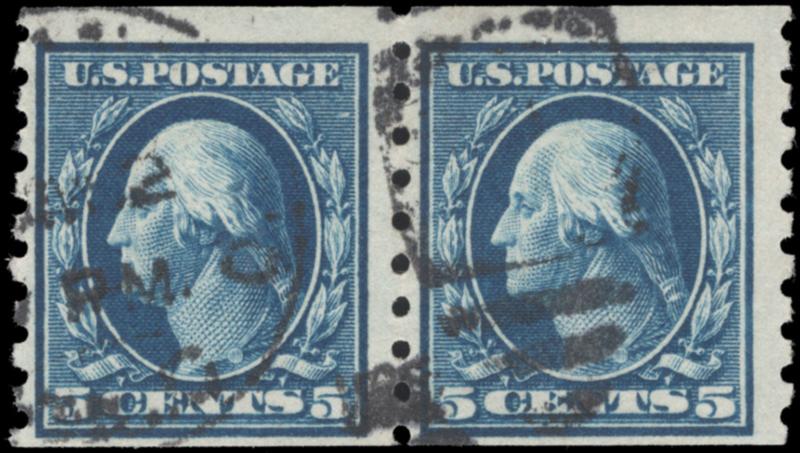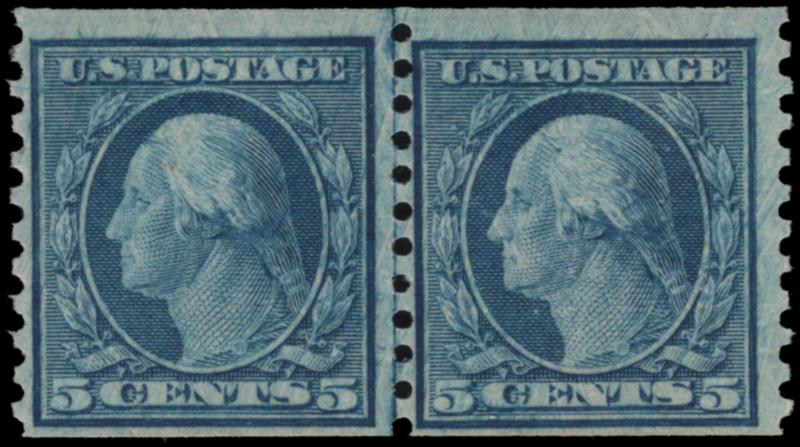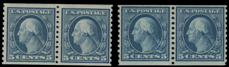 1919, 5c BLUE SMALL HOLES COIL PAIR MINT, #496a, lightly hinged, also regular pair included, very fine, cat. $233.00 (Image)