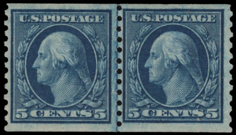 1919, 5c BLUE PERF 10 COIL SMALL HOLE VARIETY JOINT LINE PAIR MINT, #496a, very lightly hinged, fine-very fine, with 2025 William T. Crowe cert., cat. $375.00 (Image)