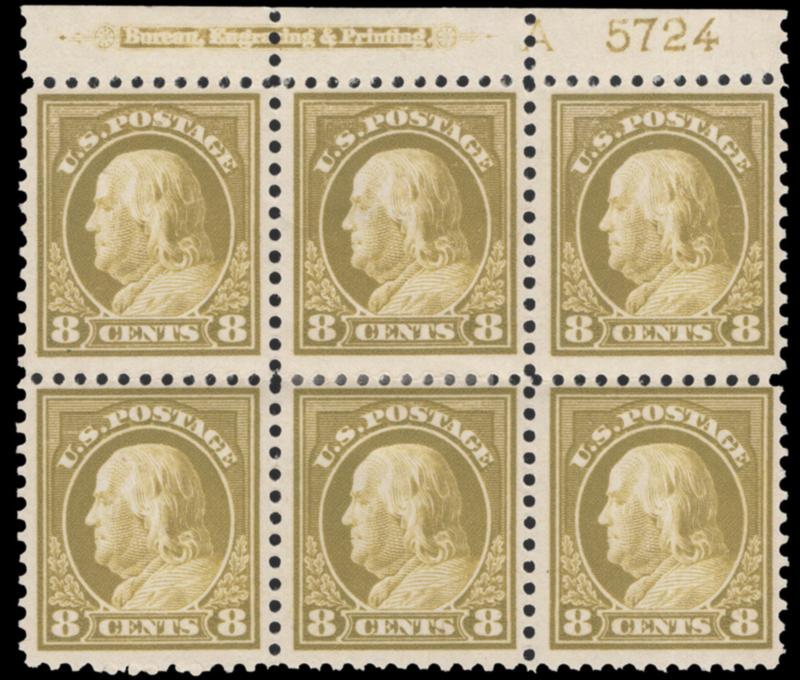 1917, 8c OLIVE BISTER TOP IMPRINT, A & PLATE #5724 BLOCK OF SIX MINT, #508, fresh, h.r., fine-very fine, cat. $170.00 (Image)