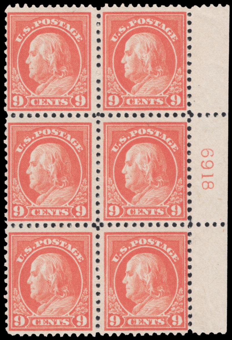 1917, 9c SALMON RED RIGHT PLATE #6918 BLOCK OF SIX MINT, #509, fresh, top right stamp h.r., others never hinged, fine-very fine, cat. $150.00 (Image)