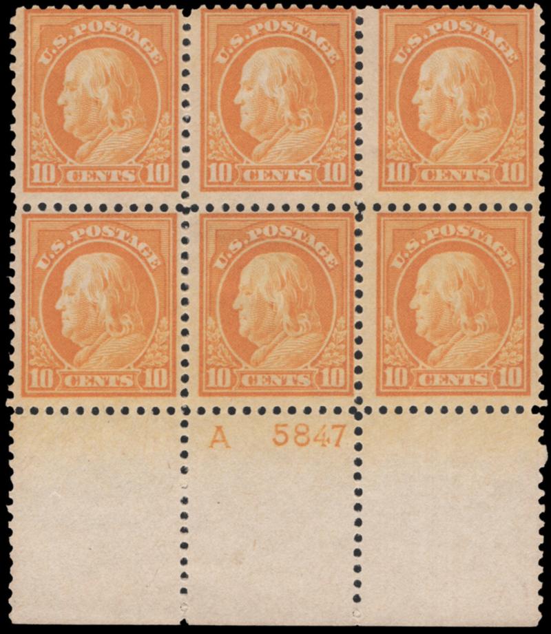 1917, 10c ORANGE YELLOW BOTTOM A & PLATE #5847 BLOCK OF SIX MINT, #510, h.r., creasing on top right stamp, fine, cat. $290.00 (Image)