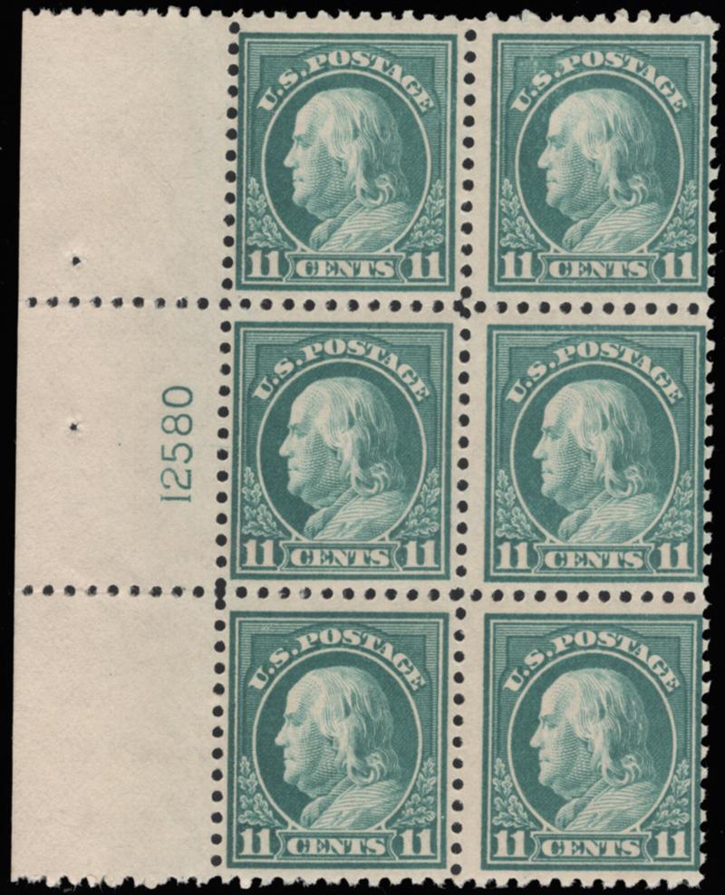 1917, 11c GREEN LEFT PLATE #12580 BLOCK OF SIX NH, #511, fresh, fine-very fine, cat. $260.00 (Image)