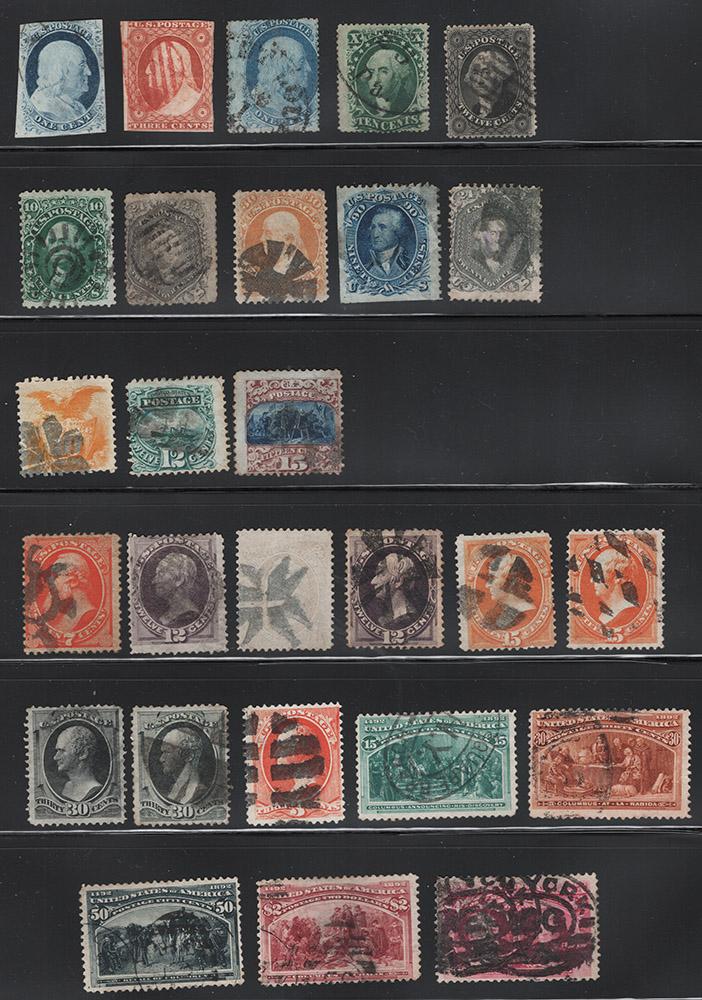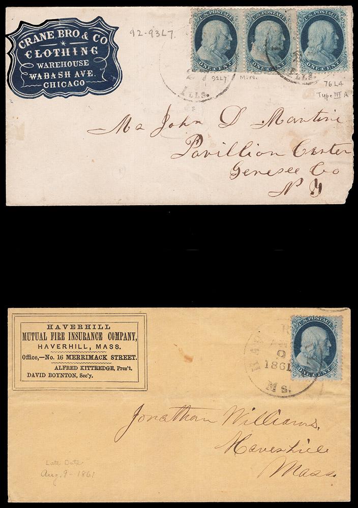 US POSTAL HISTORY GROUP 1857-69, seven covers, incl. no. 24 strip of three on embossed corner card advertising cover, #24 single usage on Fire Insurance corner card cover, #24+26 on embossed Marble Works corner card cover, #26 on "1776" patriotic cover, #30A pair showing guide line at left from gutter to Canada, single usages of nos. 112 and 113, overall fine-very fine (Image)