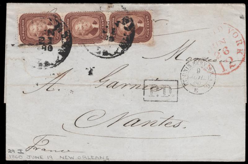 1859, 5c BROWN TYPE I STRIP OF THREE ON COVER TO FRANCE, #29, vertical strip of three tied by New Orleans, La. d.s., red New York "12" credit d.s., on June, 1860 folded cover to France, Nantes arrival d.s., fine-very fine (Image)
