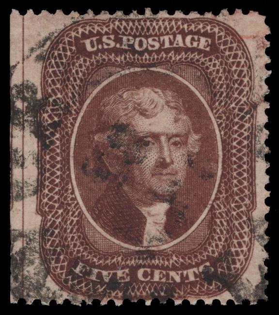 1860, 5c BROWN TYPE II - STRADDLE PANE SINGLE - USED, #30A, natural s.e. showing guide line, town cancel, very fine as such, with photocopy of 2009 PSE cert for strip of three of which this is the top stamp, cat. $375.00+ (Image)
