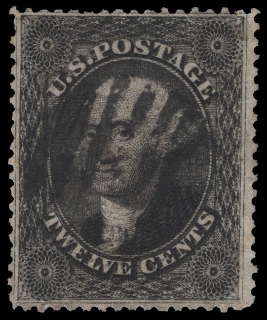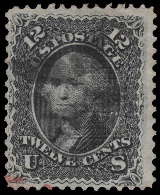 1868, 12c BLACK "E" GRILL - DOUBLE GRILL VARIETY - USED, #90 var., cork cancel, trace of red cancel, large internat tear in grill, fine, scarce variety, cat. $700.00 (Image)