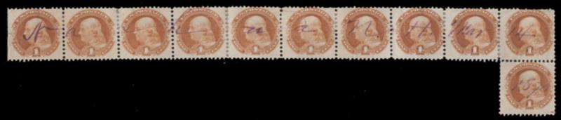 1869, 1c BUFF IRREGULAR BLOCK OF ELEVEN USED, #112, natural s.e. at left, attractive with purple manuscript cancel "Nashua N.H. Mar. 14 1870" covering the entire block, hinge reinforced, minor flaws, fine-very fine, cat. $1,760.00 as used singles (Image)