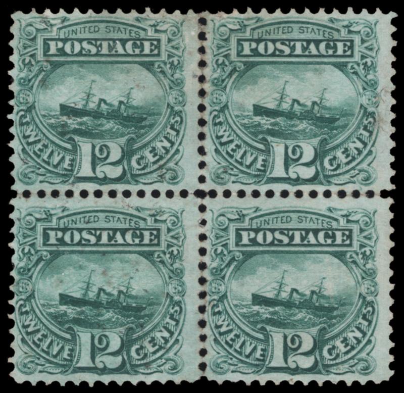 1869, 12c GREEN BLOCK OF FOUR UNUSED, #117, deep, rich color, without gum, some perf. separations rejoined with collodion, left pair negligible toning specks, fine-very fine, a scarce block particularly so well-centered compared to other known multiples, cat. $14,000.00 (Image)