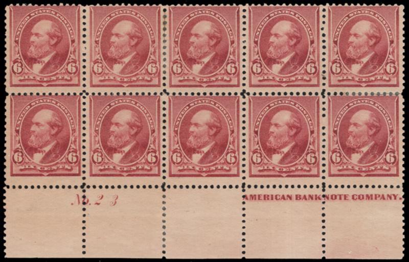 1890, 6c BROWN RED BOTTOM IMPRINT & PLATE #23 BLOCK OF TEN MINT, #224, warm shade, o.g. previously hinged, some perf. separations reinforced, fine-very fine, scarce plate block, cat. $2,750.00 (Image)