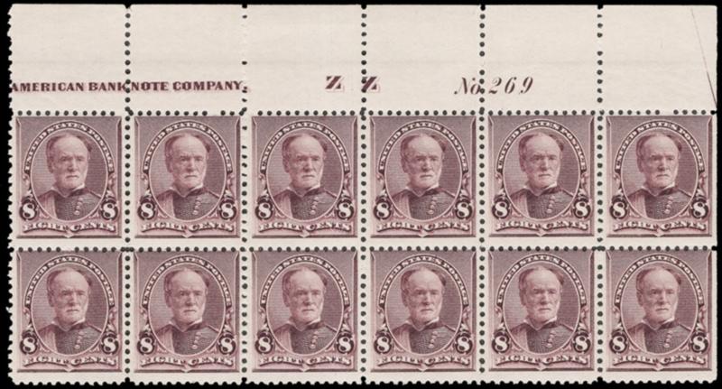1890, 8c LILAC TOP IMPRINT, "Z Z" & PLATE #269 BLOCK OF TWELVE MINT, #225, deep shade, fresh, five stamps lightly hinged, others never hinged, slight perf sep in right vertical pair (outside of the plate block of ten), a fine and quite scarce top plate block, cat. $2,095.00 as plate of ten and two singles (Image)