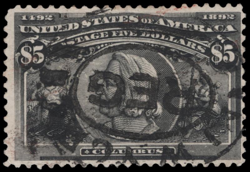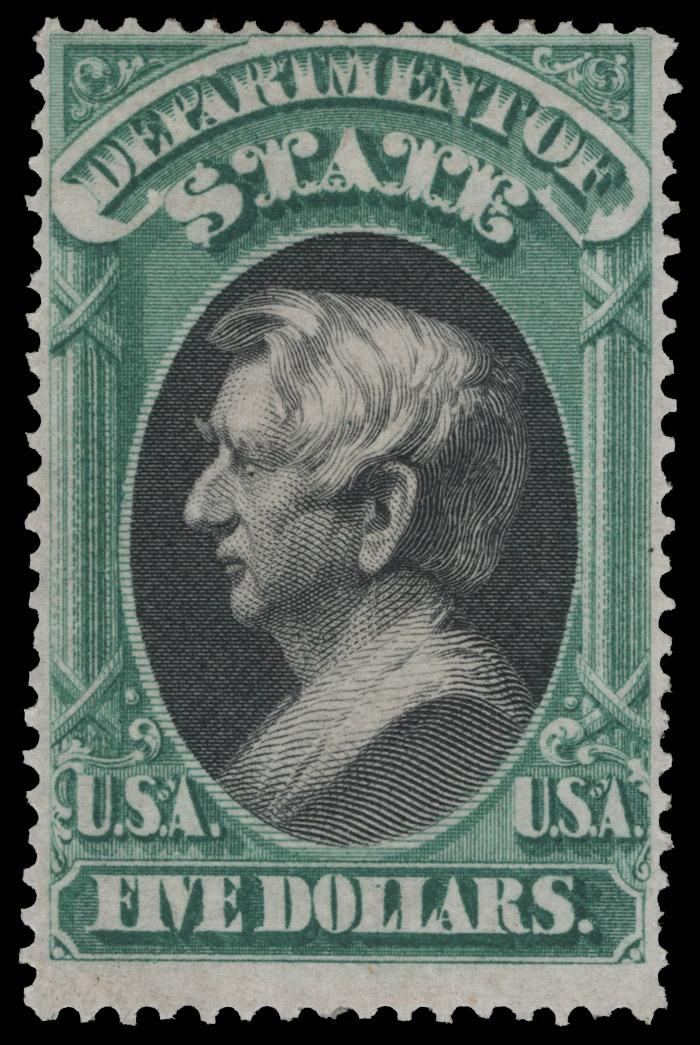 1873, $5 GREEN & BLACK STATE DEPT. MINT, #O69, fresh in attractive centering, slightly mount disturbed original gum, fine-very fine, with 2006 P.F. cert., o lovely example of the scarcest dollar value State Dept. stamps, cat. $8,000.00 (Image)