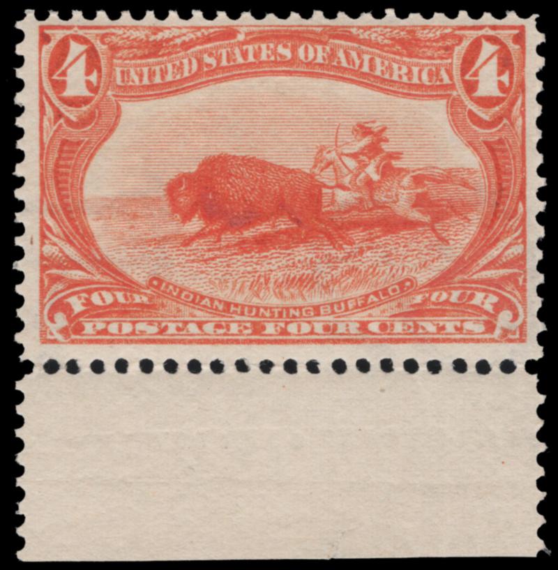 1898, 4c TRANS-MISSISSIPPI NH, #287, fresh and well-centered bottom selvage single, slight natural gum bends, very fine, cat. $325.00 (Image)