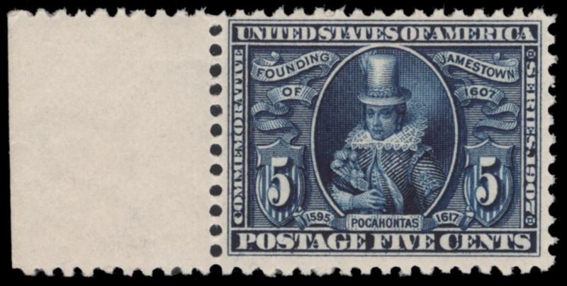 1907, 5c JAMESTOWN NH, #330, well-centered left margin selvage single, very fine, cat. $375.00 (Image)