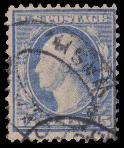 1911, 15c PALE ULTRAMARINE ON BLUISH USED, #366, double ring oval cancels, fine, rare used, with 2001 APS cert., cat. $16,000.00 (Image)