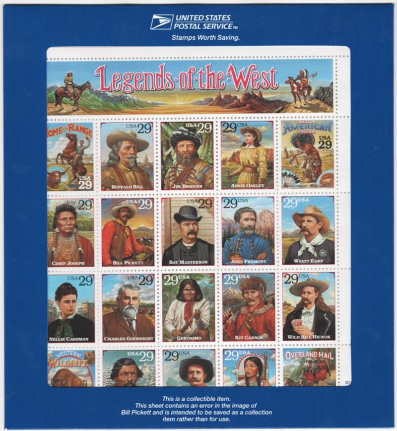1994 LEGENDS OF THE WEST RECALLED SHEET, #2870, in original folder, very fine, cat. $125.00 (Image)