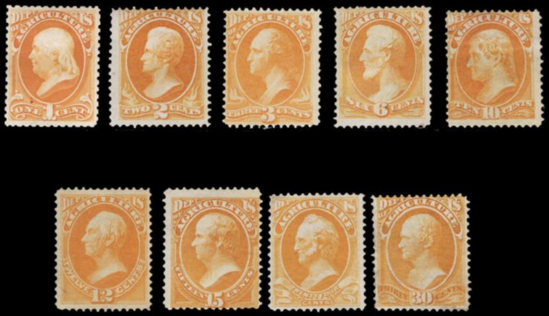 1873, 1c-30c YELLOW AGRICULTURE MINT, #O1-O9, all o.g. except 24c without gum, some heavily hinged, few flaws, overall sound and attractive, cat. $3,250.00 (Image)