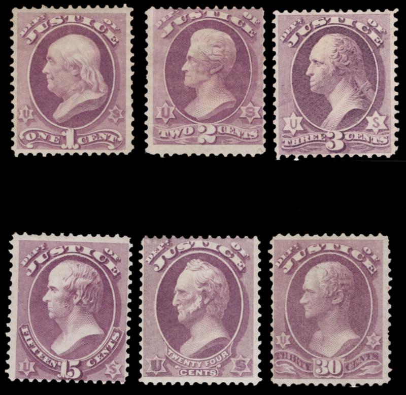 1873, 1c-30c PURPLE JUSTICE MINT, #O25-O27, O31, O32, O33, six diff. incl. . 1c-3c, 15c, 24c and 30c, fresh colors, o.g. or part o.g., few heavy hinge, overall sound and attractive, cat. $3,910.00 (Image)