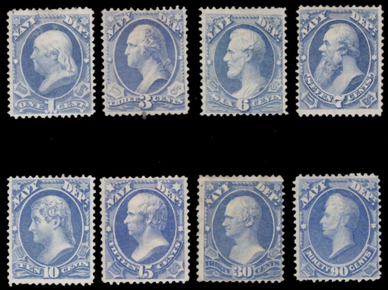 1873, 1c-90c ULTRAMARINE NAVY DEPT UNUSED GROUP, #O35, O37-O40, O42, O44, O45, eight diff. values, without gum or regummed, 90c short perf., overall fine-very fine, cat. $1,505.00 (Image)