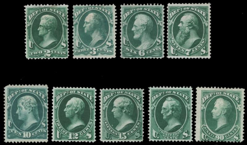 1873, 2c-90c DARK GREEN STATE DEPT. UNUSED, #O58-O65, O67, nine diff., without gum or regummed, 90c tiny thin spot, overall fine-very fine, cat. $1,705.00 (Image)