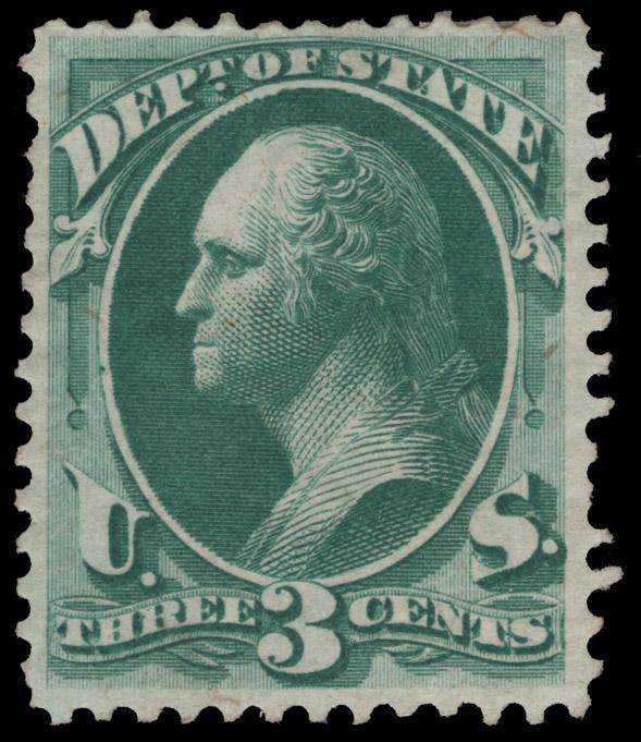 1873, 3c DARK GREEN STATE DEPT. MINT, #O59, quite well -centered, o.g. large h.r., fine-very fine, cat. $220.00 (Image)