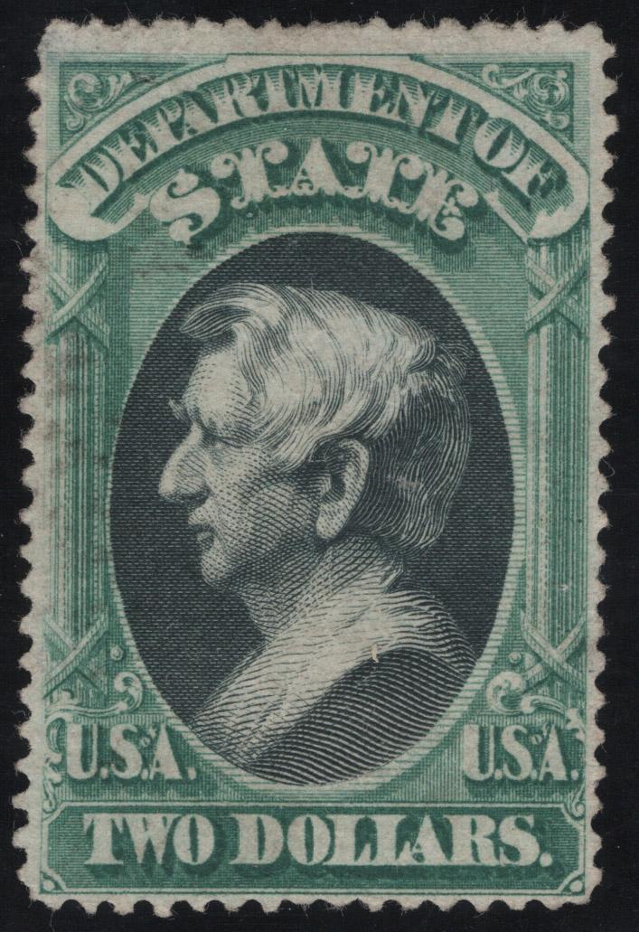 1873, $2 GREEN & BLACK STATE DEPT. UNUSED, #O68, without gum, tint thin spot, fine-very fine, cat. $850.00 (Image)