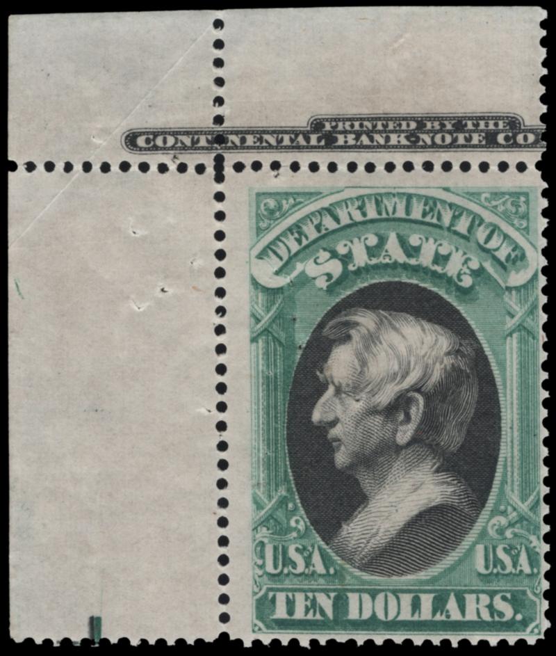 1873, $10 GREEN & BLACK STATE DEPT. TOP LEFT CORNER IMPRINT SINGLE MINT, #O70, fresh and quite well-centered, lightly hinged original gum, few pin holes in the stamp and selvage, top left selvage corner crease well clear of stamp, fine-very fine, with 2025 William T. Crowe cert., cat. $4,500.00 (Image)