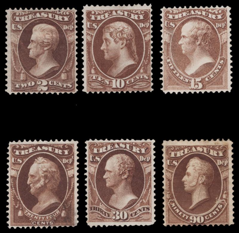 1873, 2c-90c BROWN TREASURY DEPT. UNUSED, #O73, O77, O79-O82, without gum or regummed, overall fine-very fine, cat. $1,037.50 (Image)