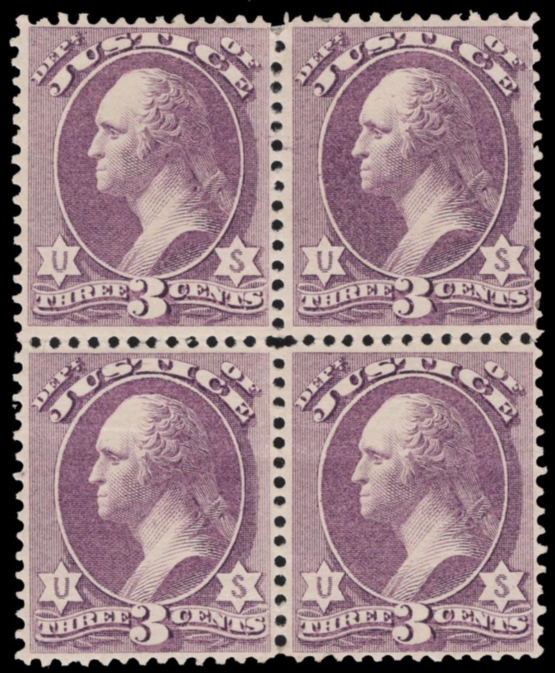 1879, 3c PURPLE JUSTICE DEPT. ON SOFT BLOCK OF FOUR MINT, #O106, quite well-centered, o.g., previously hinged, bottom pair horizontal creases, fine-very fine, with 2011 P.F. cert., cat. $1,150.00 (Image)