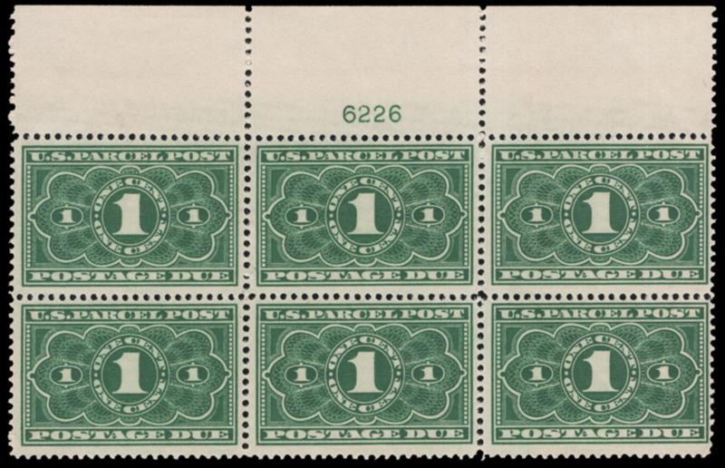 1913, 1c DARK GREEN PARCEL POST POSTAGE DUE TOP PLATE #6226 OF SIX NH, #JQ1, fresh, hinged in ungummed part of selvage, fine-very fine, cat. $750.00 as NH (Image)