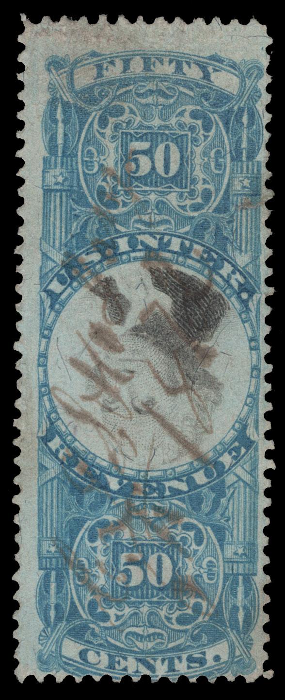 1871, 50c BLUE & BLACK - INVERTED CENTER - USED, #R115b, manuscript cancel, tiny tear, fine, with 2024 William T. Crowe cert., cat. $1,150.00 (Image)