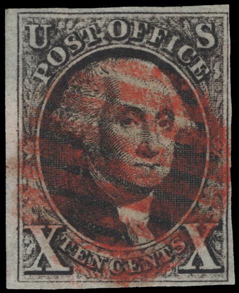 1847, 10c BLACK WITH RED GRID CANCEL SPERATI REPRODUCTION, Sperati US #2, full margins, red "Counterfeit" handstamp on back, fine-very fine as such, with 2017 P.S.A.G. cert., attractive and much sought after Sperati reproduction (Image)