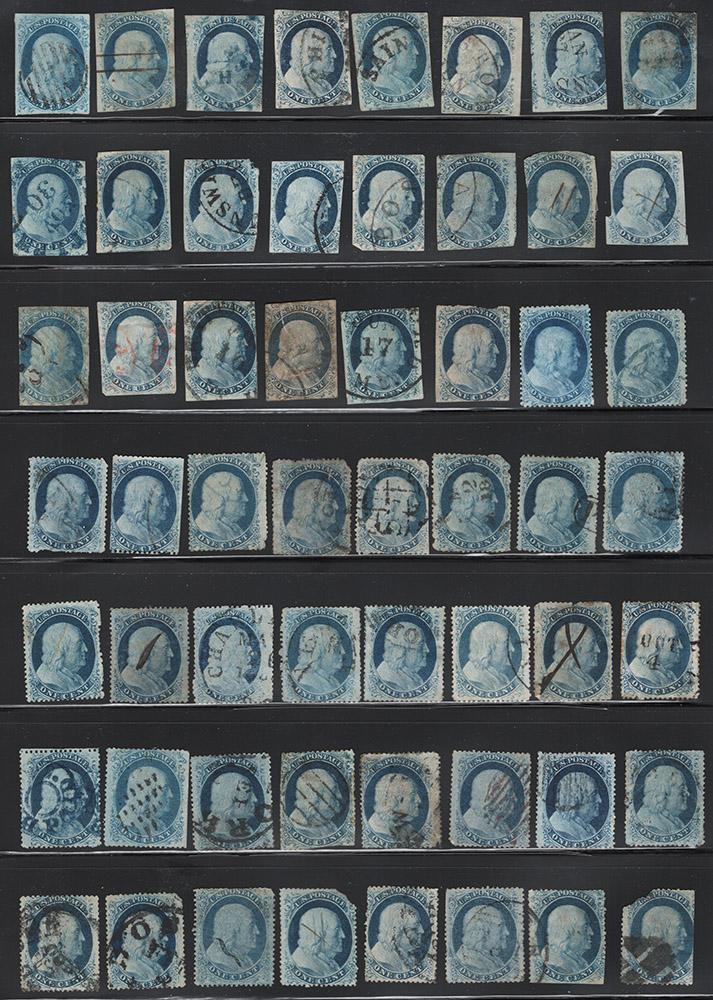 1851-60, 1c BLUE TYPES - SECOND QUALITY GROUP ON STOCKPAGE, #7//24, 22 imperforated and 53 perforated, all with flaws, single #24 showing significant plate crack, useful study group (Image)