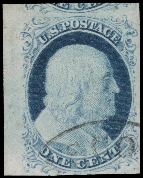 1851, 1c BLUE TYPE IV USED GRADED '95J', #9, pos. 61R1L, huge marhings showing selvage at left, light unobtrusive town cancel leaving the design free, extremely fine - superb, with 2006 PSE cert. graded '95J", scarce in this condition, SMQ $800.00 (Image)