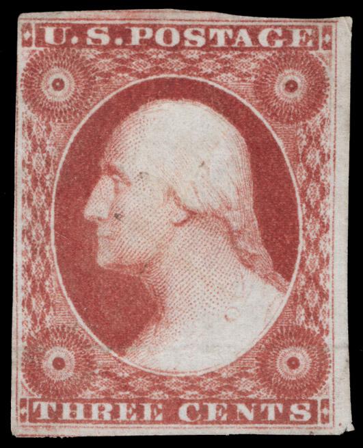 1851, 3c ORANGE BROWN TYPE I UNUSED, #10, warm, bright shade, full margins, just barely in at left, no gum, tiny corner wrinkle, horizontal crease, three tiny ink spots on face, fine, cat. $2,400.00 (Image)