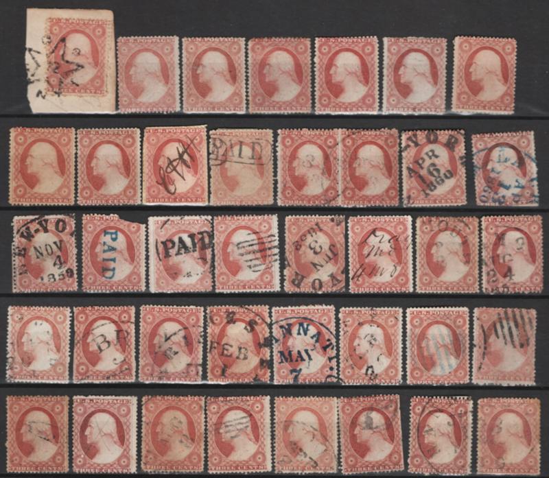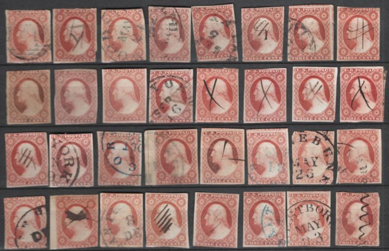 1857, 3c RED IMPERFORATED (SHADES) TYPES I-II ACCUMULATION, 25//26, 240 in all, most with faults, useful study group (Image)