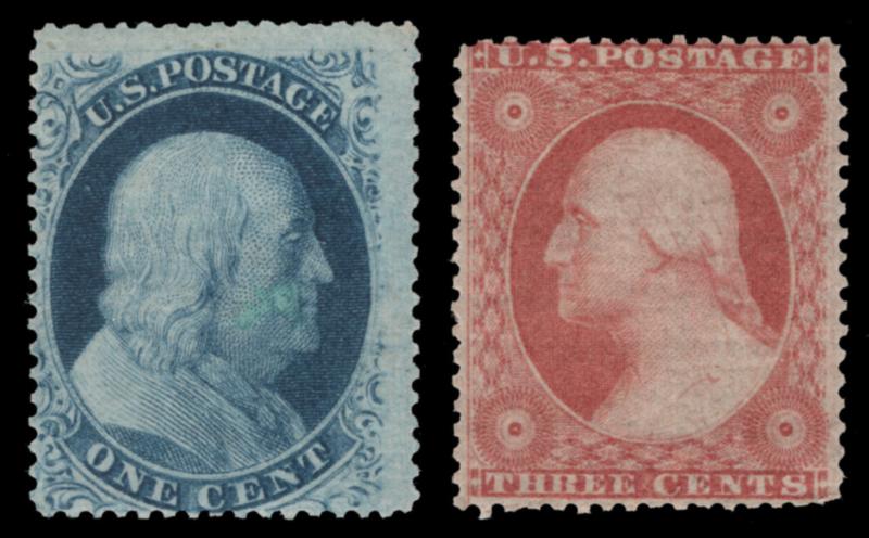 1857, 1c BLUE TYPE V, 3c DULL RED TYPE II MINT, #24, 26, fresh, o.g. barely hinged if at all, 3c slight horizontal gum bends, fine-very fine, cat. $205.00 (Image)