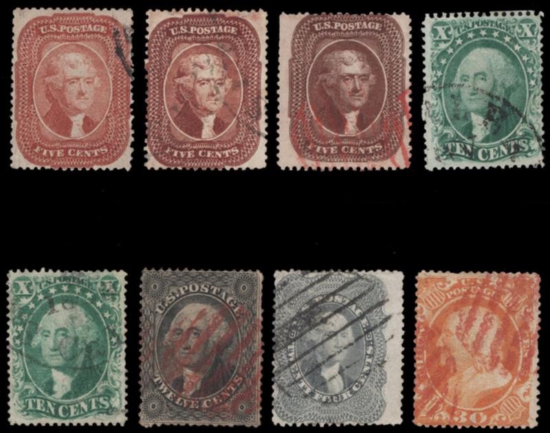 1857-60 PERFORATED ISSUES INCL. SCARCE TYPES, #27, 28, 30A, 32-33. 36. 37, 28, incl. 5c Brick Red, 5c Red Brown type I, 5c Brown type II, 10c Green types II-III, 12 Black plate 1, 24c Gray and 30c Orange, some faults, still an attractive group, cat. $4,675.00 (Image)