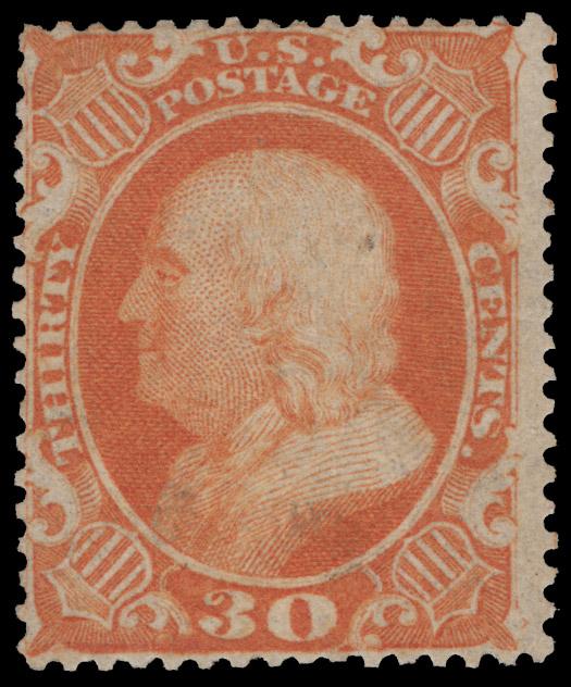 1860, 30c ORANGE MINT, #38, very fresh with brilliant color, full previously hinged original gum, fine-very fine, with 2009 PSE cert., cat. $1,900.00 (Image)