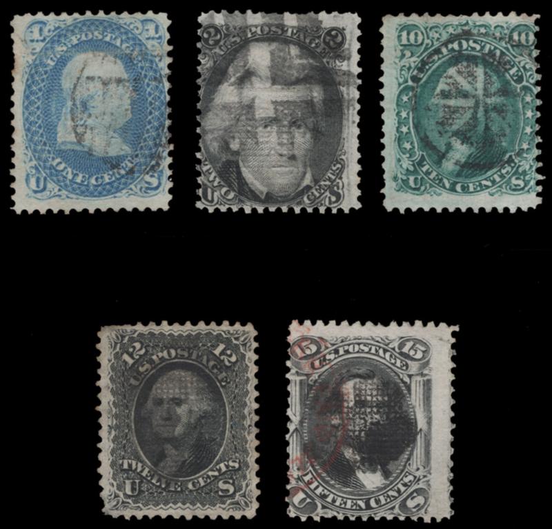 1868, 1c-15c "F" GRILLS USED, #92-93, 96-98, small faults, very good - fine, cat. $1,340.00 (Image)