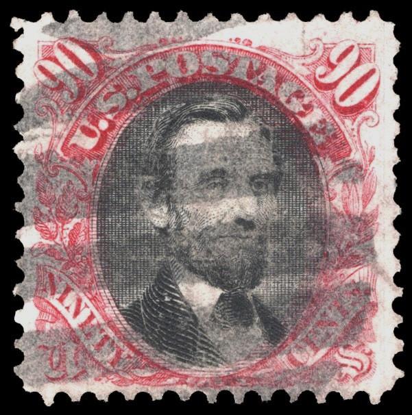 1869, 90c CARMINE & BLACK USED, #122, well-centered with wide bars cancel, attractive and very fine, with 1992 P.F. cert., cat. $2,100.00 (Image)