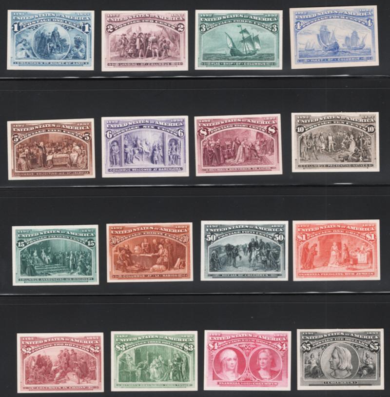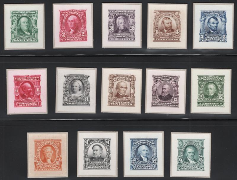 1902-03, 1c-$5 REGULAR ISSUE ROOSEVELT SMALL DIE PROOFS ON WOVE, #300P2-313P2, on original grey card backing from the presentation album, deep rich colors throughout, 50c slight hint of toning, a very fine and most attractive set, perfect to display on a single album page, cat. $4,275.00 (Image)